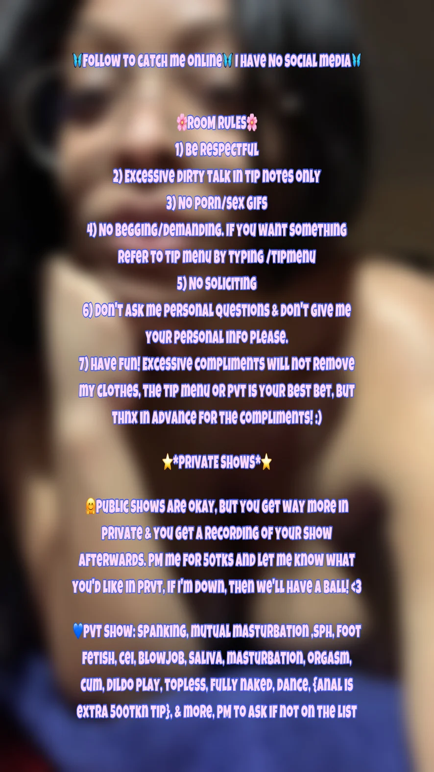 7) Have fun! Excessive compliments will not remove my clothes, the tip menu or pvt is your best bet, but thnx in advance for the compliments! :)